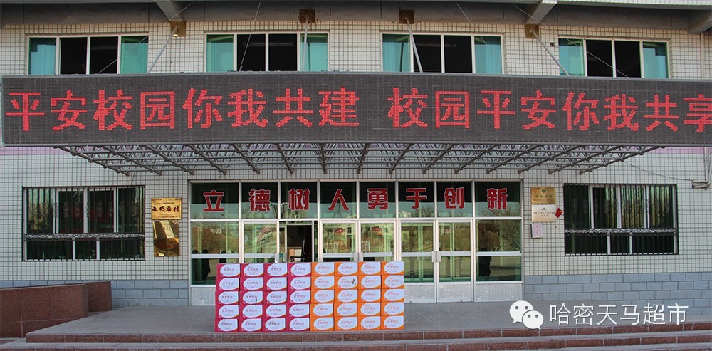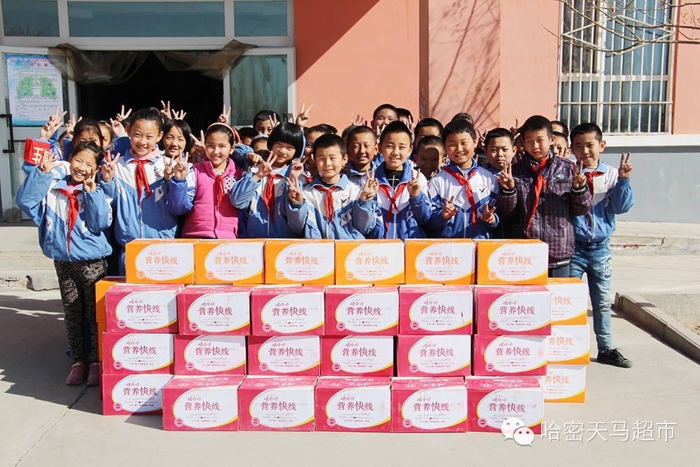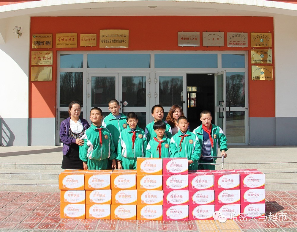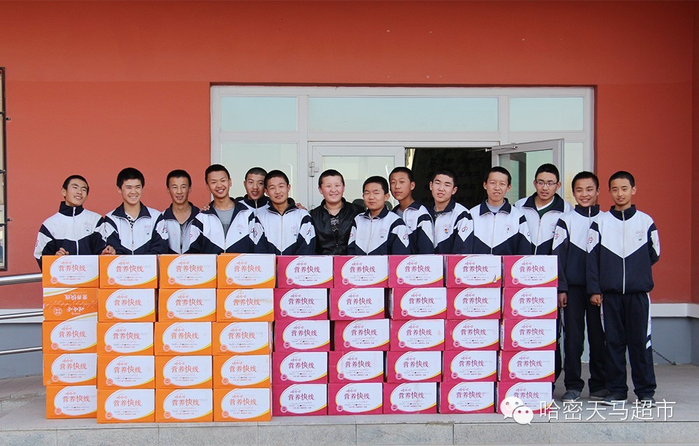 天马慰问组继慰问天山乡石城子村26户贫困家庭与这些家庭正在上学的孩子后,又慰问了哈密地区福利院,哈密特殊教育学校,哈密市三乡开发区学校,哈密市第四中学,哈密市第十中学,并给这些学校送去了价值32000元的娃哈哈营养快线。