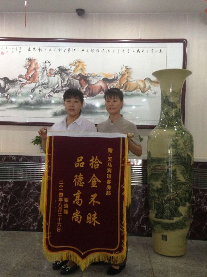 2014年8月14日10:30,天马饭店客房服务员李桂芹在打扫408号房间时拾到顾客遗落的3800元现金,她立即通知领班,并通过发票信息找到了失主张先生。面对失而复得的现金,张先生感动不已,当面要求重谢,但被李桂芹婉言谢绝,失主直夸我天马饭店管理规范,服务水平一流,员工素质高,道德水准高,当之无愧是哈密市饭店行业的资深老店,并于8月26日送来了“拾金不昧,品德高尚”的锦旗。